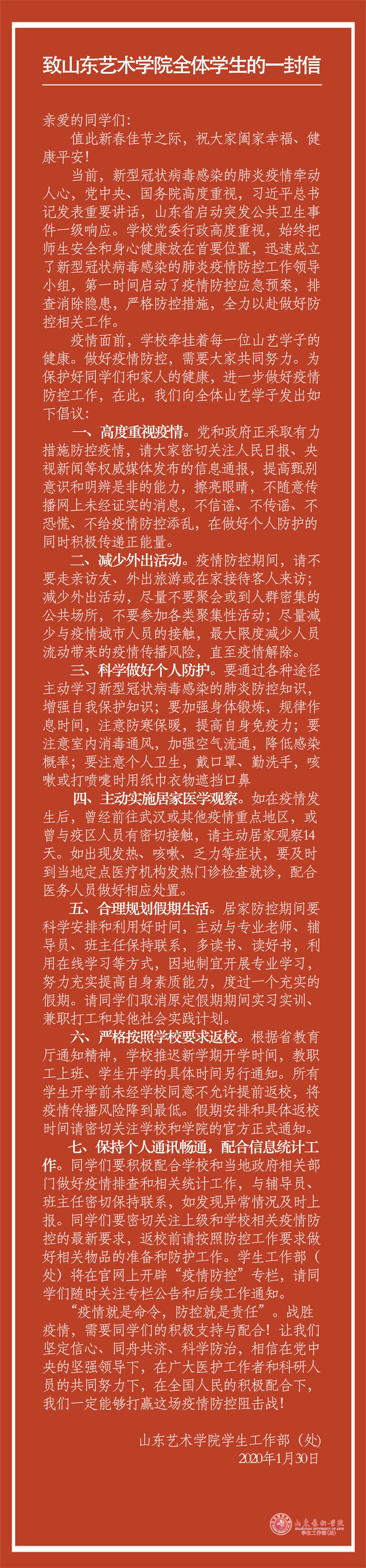 通知公告 当前位置: 本站首页 >> 通知公告 >> 正文 致山东艺术学院全体学生的一封信 发布日期:2020-02-01 点击: 上一篇:关于充分发挥全校各级党组织和广大党员干部在新型冠状病毒感染肺炎疫情防控中的战斗堡垒作用和先锋模范作用的通知 下一篇:山东艺术学院关于组织收看疫情防控特别节目的通知