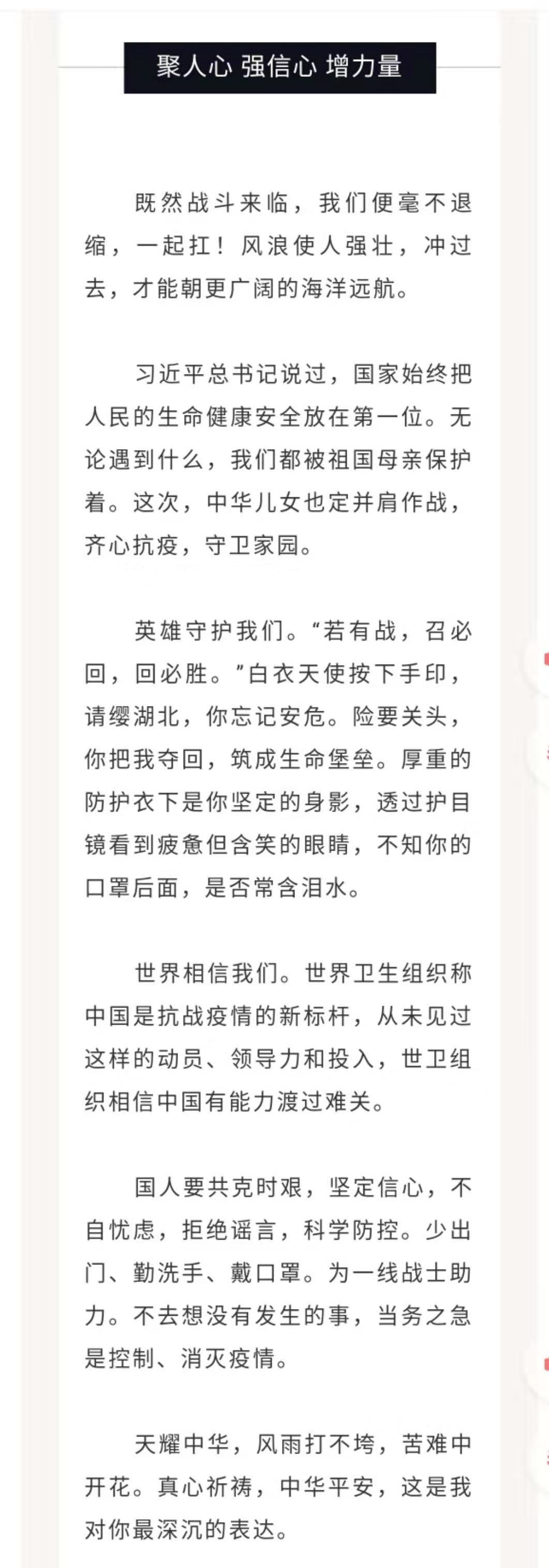 创作感想: 文字最能倾诉心声,最能安抚人心,最能沟通情感。就像纪增慧说的,天耀中华,风雨打不垮,苦难中开花。传递温暖,坚定力量。共盼春暖花开。